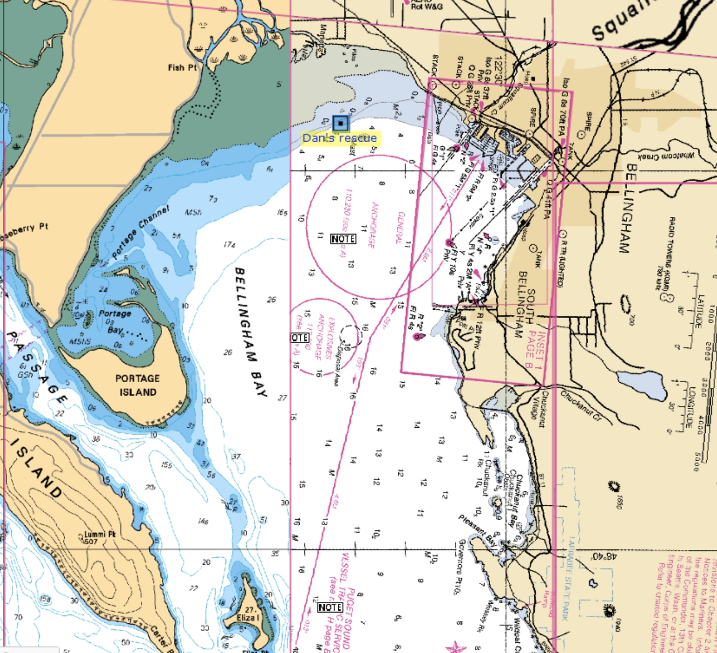 Here's a chart from Coastal Explorer, with Dan's position (as close as I could mark it) from Paul's coordinates. Paul's absolutely right about the coastline trending NE after the buoy, making us feel like we're heading out into the Bay even if still going due north. That said, Dan's position was well west of the buoy by the time he was picked up. If it had been a summer low tide, he could have walked home on the mudflats. But tide around noon on Sat would've been about +7 ft., and he was still ~a mile from shore.