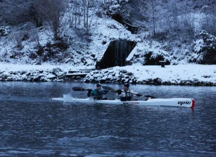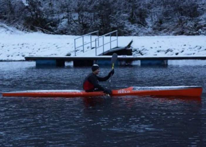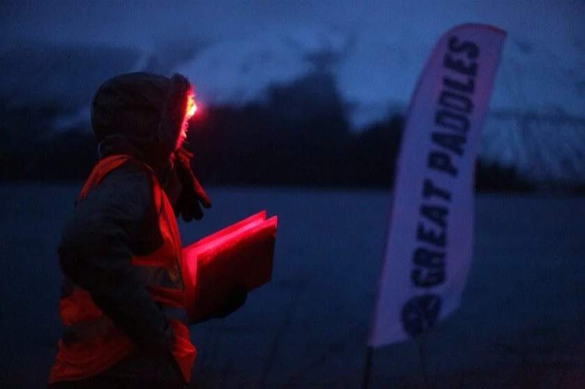 The race started on the flat water of the canals in the west of Scotland, the snow was falling heavily, it was about 5am, dark and cold. I chose my outfit as I always have with the emphasis on being able to perform well rather than for an emergency situation, probably the one decision that saved the day though was I decided against a last minute change to lycra leggings instead of the neoprene trousers I was wearing. The wind was a following one and to be fair I wouldn’t have started the race had it not been, my fitness was not up to a 60 mile headwind!
