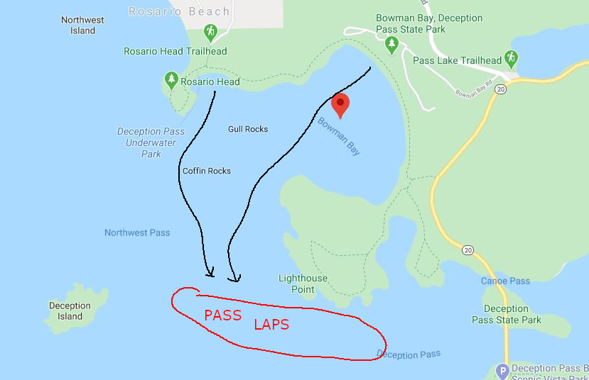 Launching from the northside is also possible albeit with a longer paddle to the main tidal current. There are 2 convenient Deception Pass State Park launches on the north side - Bowman Bay and Rosario Head (less paddling, longer carry). As with the southside, you are looking at lap paddling, surfing to the east with east moving waves closer to Lighthouse Point, then easily floating with the ebb tidal current back to the west to start over again.