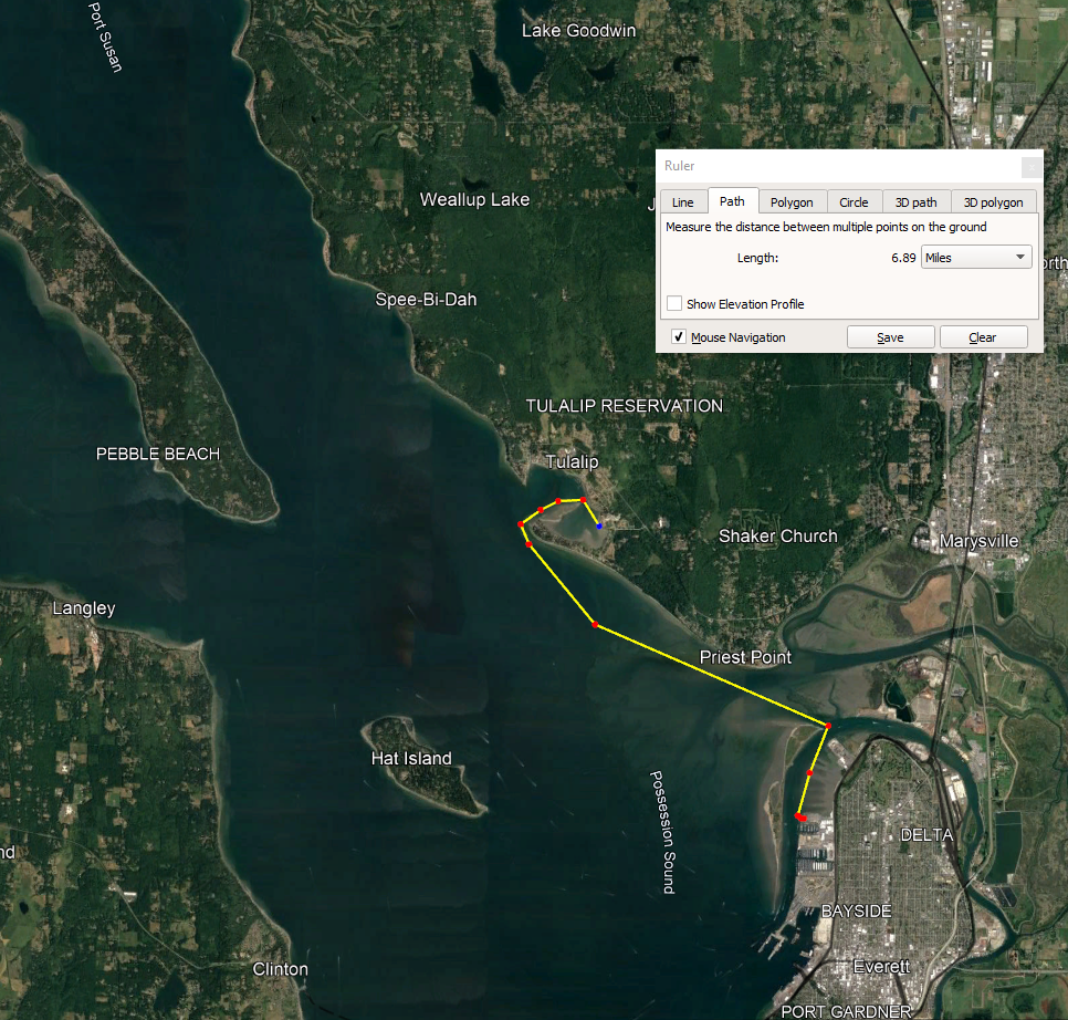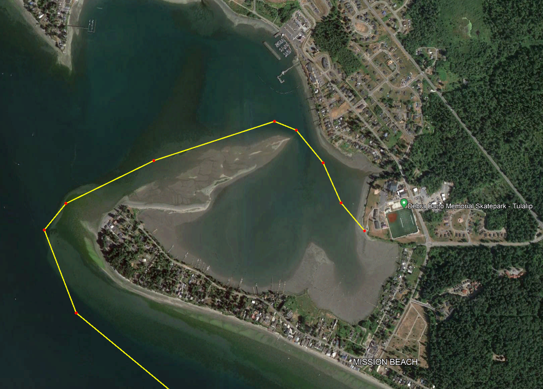 Tulalip Bay - 10th Street boat ramp in Everett follows the typical summer wind direction. Straight downwind. Don’t miss the turn at the north end of the Island to go down the River. During the fall and winter storms the wind has just a slight bit more north in it and one would have to surf to the middle or south end of the Island.