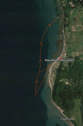 • Jim Schulz: “ Maxwelton Beach seems to be the best spot with the long fetch from Seattle and the fact that is gets deep very close to shore. There is a swell train paralleling the shore and fairly close to shore. It reminds me of standing on Highway 14 and looking at the waves in the Columbia. And the paddle upwind is protected by Swede Hill and Indian Point so I can get upwind easily and get more laps in. I’ll go farther south off Indian Point if the wind is lighter and more SE. I’ve done laps up in Bellingham out of Marine Park probably 30 times and this is bigger and better quality. I still haven’t done it on a flood tide yet…. I still want to try laps at Dave Mackie County Park at Maxwelton during a flood tide and paddle south, there should be a bit more tide and it should be perpendicular to the wind. ” (Dec. 2020)