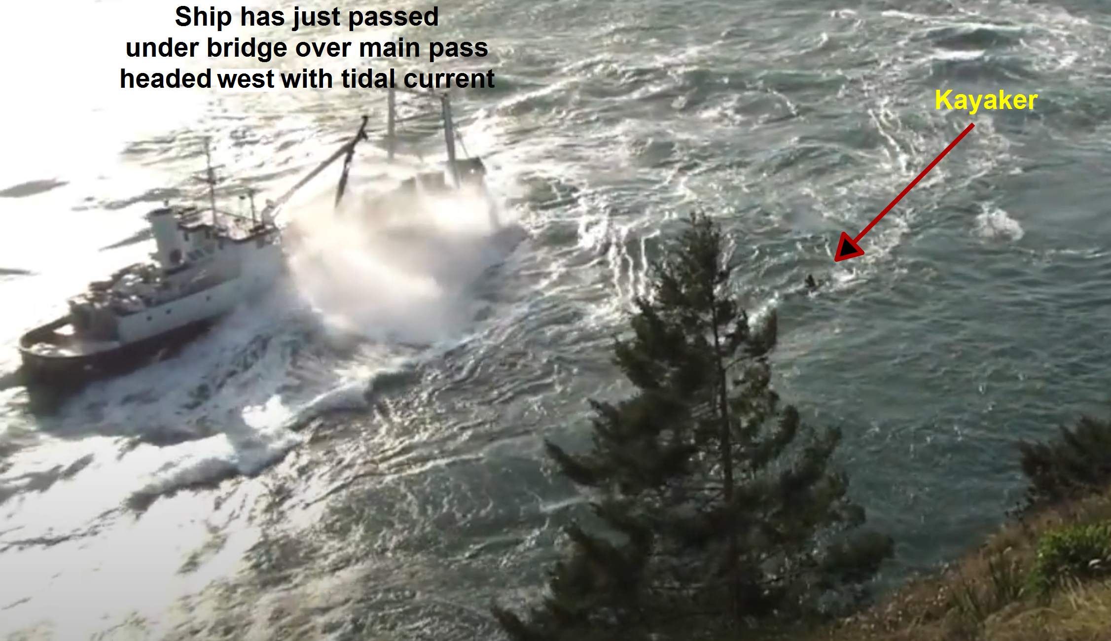 Video showing glassy and rough (low local wind, medium+ wave day) starting in glassy section west of bridge and going 2km straight west with current instead of surfing waves from west to east (expert level surfskier in video - stayed north of the roughest water that day).