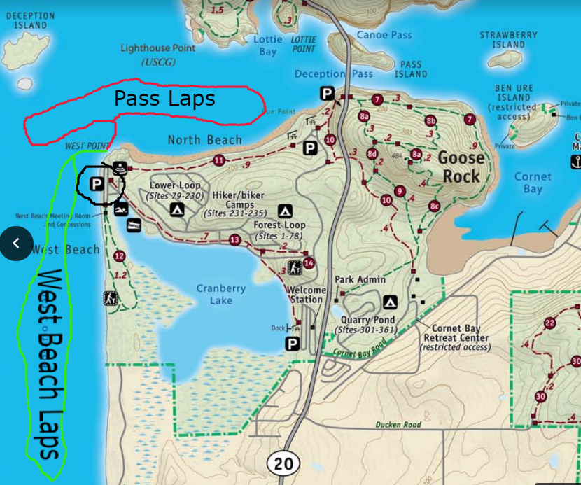 Launching on the south side of the tidal current there are two primary paddling options: The Pass Paddle and West Beach Paddle. They are both lap paddles, not downwinders.The Pass Paddle is paddling laps east and west between West Point and Deception Island. The West Beach Paddle is paddling laps north and south in the Rosario Straight parallel to West Beach.