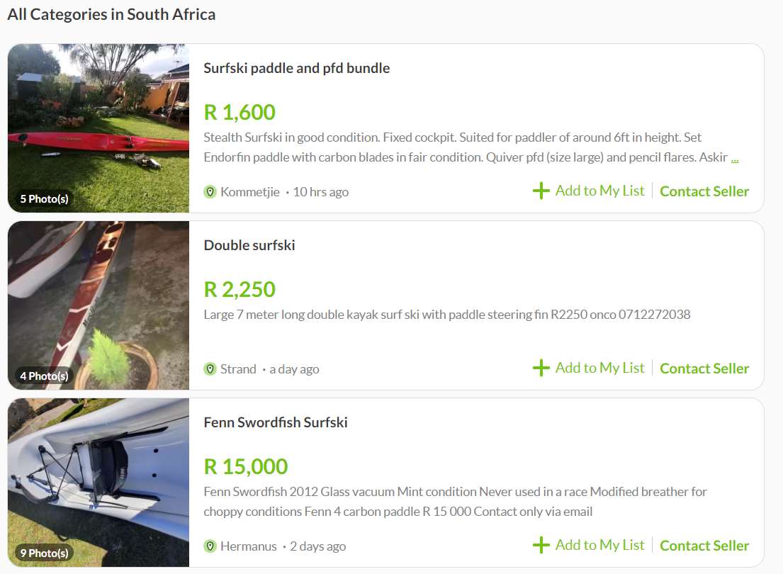 For facebook sales groups - you can try methods like doing searches for “surfski” within facebook groups to narrow down what you are looking through, but be aware that some ads for surfski sales just mention the boat brand and model and do not even mention “surfski”.